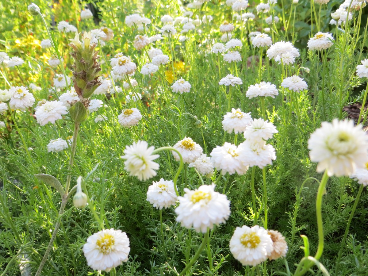 Frauenmantel, Küchenschelle, Kamille, Wilder Majoran (Dost), Weinraute, Mutterkraut, Gänsefingerkraut, Beifuß, Schafgarbe, Hirtentäschel, Eisenkraut, Rose, Muskatellersalbei, Mönchspfeffer, Salbei, Himbeere, Nachtkerze, Traubensilberkerze, Geißraute, virg. Helmkraut, Diptam, Taubnessel, sibirischer Rhabarber (Rheum rhapontikum)